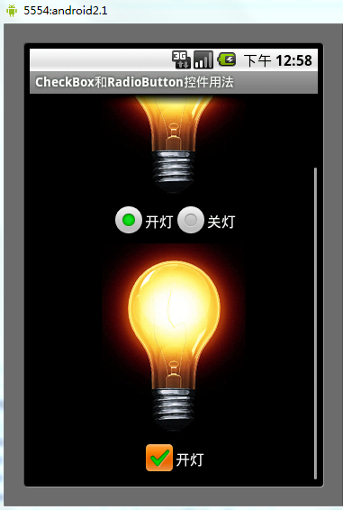 | <?xml version="1.0" encoding="utf-8"?> <ScrollView xmlns:android="http://schemas.android.com/apk/res/android" android:layout_width="fill_parent" android:layout_height="fill_parent" android:scrollbars="vertical"> <LinearLayout android:orientation="vertical" android:layout_width="fill_parent" android:layout_height="fill_parent"> <ImageView android:id="@+id/imageView01" android:layout_width="wrap_content" android:layout_height="wrap_content" android:src="@drawable/bulb_on" android:layout_gravity="center_horizontal" /> <RadioGroup android:id="@+id/radioGroup" android:orientation="horizontal" android:layout_width="wrap_content" android:layout_height="wrap_content" android:layout_gravity="center_horizontal"> <RadioButton android:id="@+id/on" android:text="开灯" android:layout_width="wrap_content" android:layout_height="wrap_content" android:checked="true" /> <RadioButton android:id="@+id/off" android:text="关灯" android:layout_width="wrap_content" android:layout_height="wrap_content" /> </RadioGroup> <ImageView android:id="@+id/imageView02" android:layout_width="wrap_content" android:layout_height="wrap_content" android:src="@drawable/bulb_on" android:layout_gravity="center_horizontal" /> <CheckBox android:id="@+id/checkBox" android:text="开灯" android:checked="true" android:layout_width="wrap_content" android:layout_height="wrap_content" android:layout_gravity="center_horizontal" /> </LinearLayout> </ScrollView>