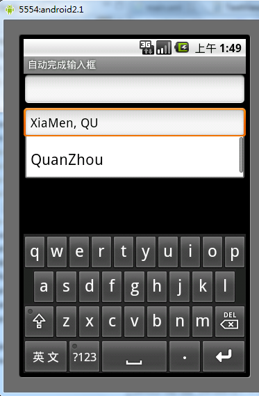 public class TextViewActivity extends Activity { private static final String[] cities=new String[] {"FuZhou", "XiaMen", "NiDe", "PuTian","QuanZhou", "ZhangZhou", "LongYan", "SanMing","NanPing"}; private AutoCompleteTextView autoCompleteTextView=null; private MultiAutoCompleteTextView multiAutoCompleteTextView=null; @Override public void onCreate(Bundle savedInstanceState) { super.onCreate(savedInstanceState); setContentView(R.layout.main); autoCompleteTextView=(AutoCompleteTextView)findViewById(R.id.autoCompleteTextView); multiAutoCompleteTextView=(MultiAutoCompleteTextView)findViewById(R.id.multiAutoCompleteTextView); ArrayAdapter<String> adapter=new ArrayAdapter<String>( this, android.R.layout.simple_dropdown_item_1line, cities); autoCompleteTextView.setAdapter(adapter); autoCompleteTextView.setThreshold(2); multiAutoCompleteTextView.setAdapter(adapter); multiAutoCompleteTextView.setThreshold(2); multiAutoCompleteTextView.setTokenizer(new MultiAutoCompleteTextView.CommaTokenizer()); } }